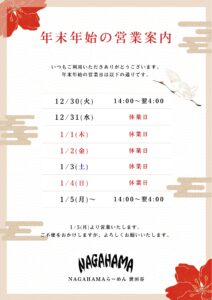 年末年始営業時間のお知らせ 2025.12.26 12/31(水)〜1/4(日)まで休業させていただきます。 1/5(月)14:00〜営業再開致します。 ご不便おかけいたしますが、よろしくお願い致します。